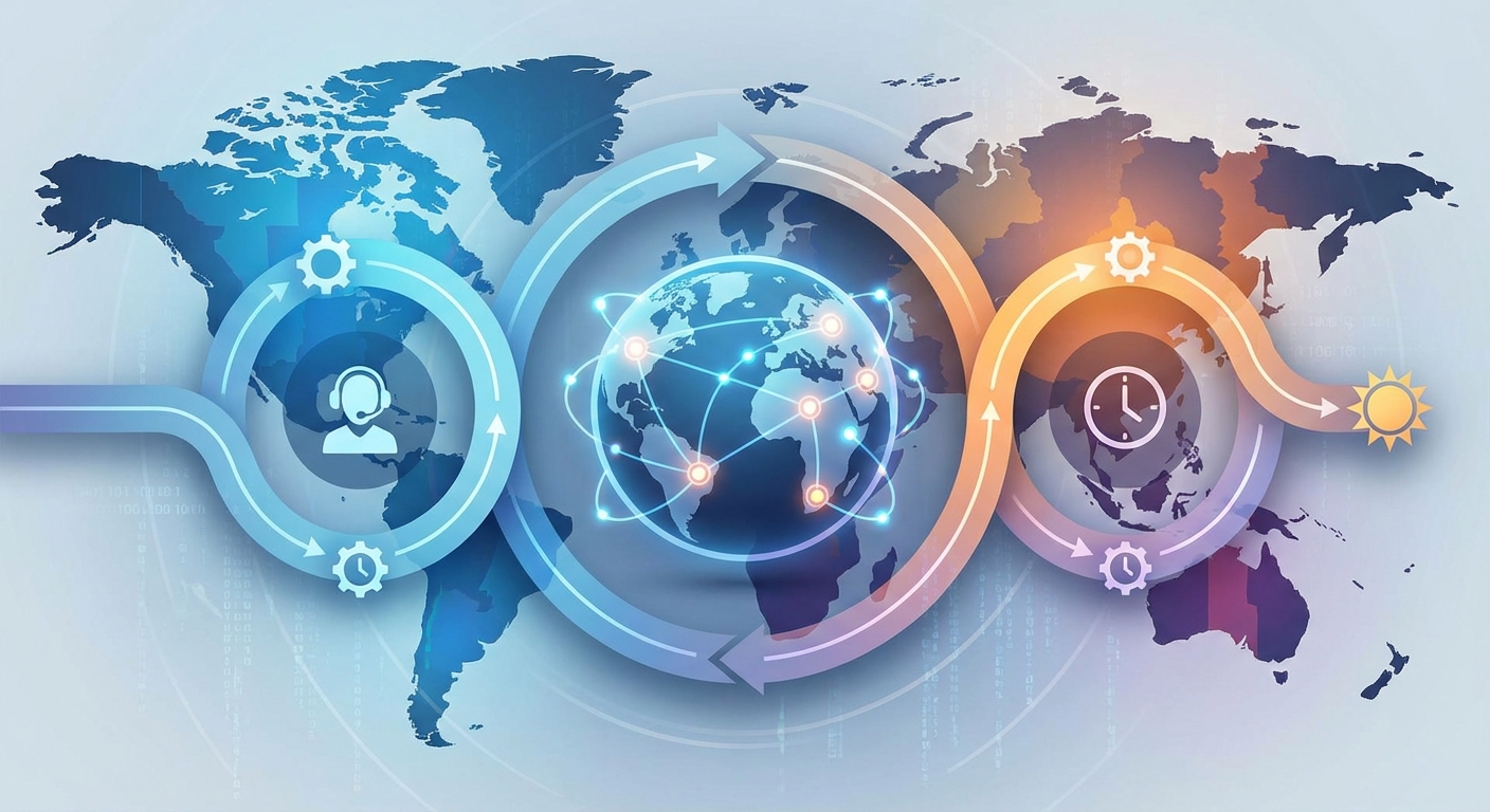 The follow the sun support model distributes customer service teams across multiple time zones to provide continuous 24/7 coverage. Work passes from one region to the next as the business day ends, eliminating night shifts while maintaining round-the-clock availability. This approach reduces response times, prevents burnout, and scales naturally with global growth when implemented with proper handoff protocols and communication systems.